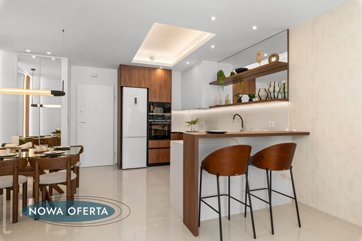 Apartamenty mają 2 sypialnie i 2 łazienki oraz 3 sypialnie i 2 łazienki, a także otwartą kuchnię i salon z jadalnią. Można wybrać opcję parteru z pięknym prywatnym ogrodem lub najwyższego piętra z przestronnym solarium.