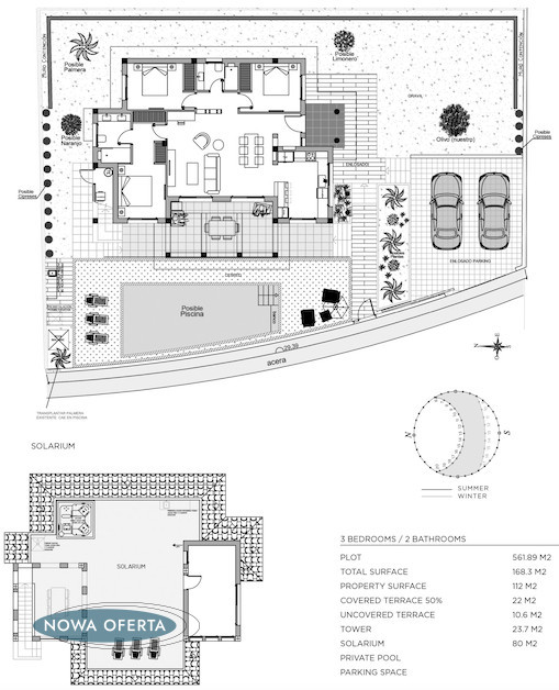 The villa has 3 bedrooms and 2 bathrooms, a spacious living room with double-height ceilings in the dining room, providing more light and a feeling of space. You can also enjoy the outdoor areas, such as the solarium and garden with private pool.